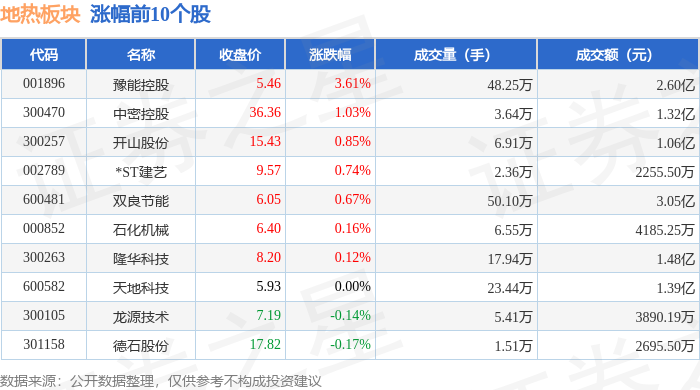 证券之星消息,9月30日地热板块较上一交易日下跌0.88%,杰瑞股份领跌。当日上证指数报收于3882.78,上涨0.52%。深证成指报收于13526.51,上涨0.35%。地热板块个股涨跌见下表: