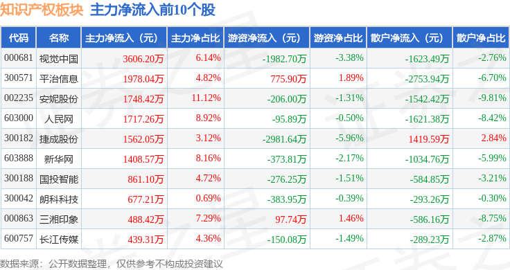 从资金流向上来看,当日知识产权板块主力资金净流出1.17亿元,游资资金净流入4177.43万元,散户资金净流入7546.54万元。知识产权板块个股资金流向见下表: