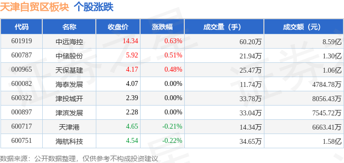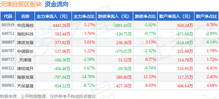 从资金流向上来看,当日天津自贸区板块主力资金净流入3315.37万元,游资资金净流出4345.55万元,散户资金净流入1030.18万元。天津自贸区板块个股资金流向见下表: