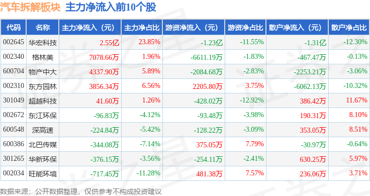从资金流向上来看,当日汽车拆解板块主力资金净流入2.73亿元,游资资金净流出1.77亿元,散户资金净流出9569.39万元。汽车拆解板块个股资金流向见下表: