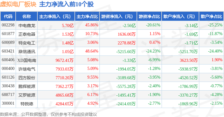 从资金流向上来看,当日虚拟电厂板块主力资金净流入2.53亿元,游资资金净流出3.54亿元,散户资金净流入1.01亿元。虚拟电厂板块个股资金流向见下表:
