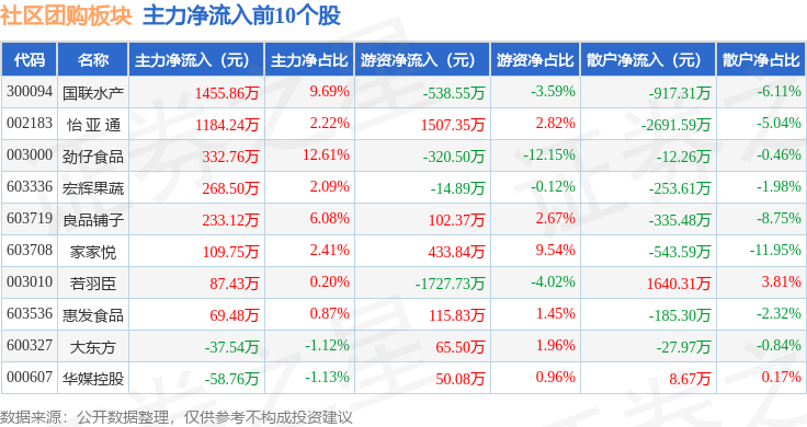 从资金流向上来看,当日社区团购板块主力资金净流出3.75亿元,游资资金净流入1.03亿元,散户资金净流入2.72亿元。社区团购板块个股资金流向见下表: