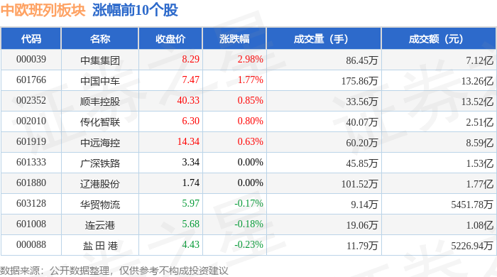 证券之星消息,9月30日中欧班列板块较上一交易日上涨0.43%,中集集团领涨。当日上证指数报收于3882.78,上涨0.52%。深证成指报收于13526.51,上涨0.35%。中欧班列板块个股涨跌见下表: