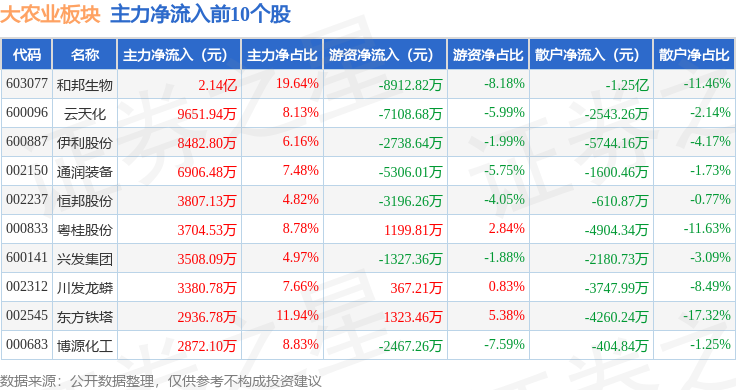 从资金流向上来看,当日大农业板块主力资金净流出1.94亿元,游资资金净流出1.69亿元,散户资金净流入3.63亿元。大农业板块个股资金流向见下表: