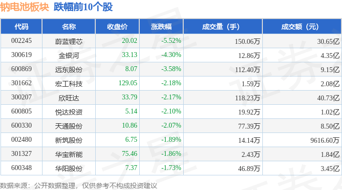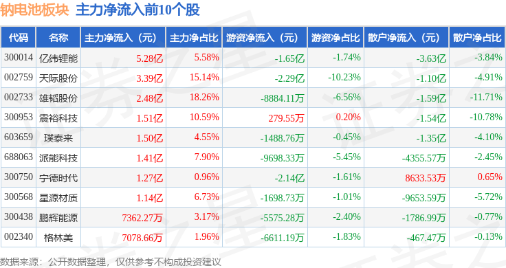 从资金流向上来看,当日钠电池板块主力资金净流出13.66亿元,游资资金净流出2.59亿元,散户资金净流入16.26亿元。钠电池板块个股资金流向见下表: