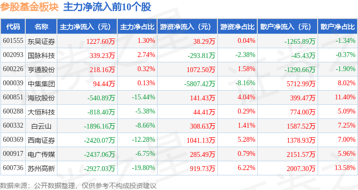 从资金流向上来看,当日参股基金板块主力资金净流出89.1亿元,游资资金净流入33.9亿元,散户资金净流入55.2亿元。参股基金板块个股资金流向见下表: