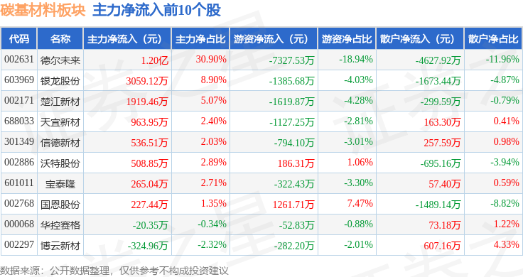 从资金流向上来看,当日碳基材料板块主力资金净流入1.15亿元,游资资金净流出1.14亿元,散户资金净流出101.95万元。碳基材料板块个股资金流向见下表:
