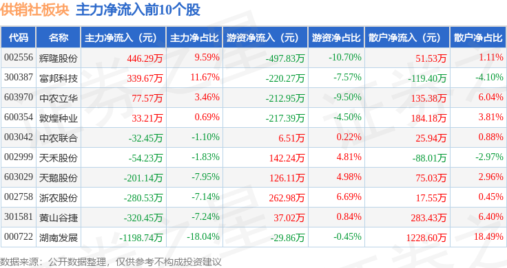 从资金流向上来看,当日供销社板块主力资金净流出1.04亿元,游资资金净流入1812.66万元,散户资金净流入8632.72万元。供销社板块个股资金流向见下表: