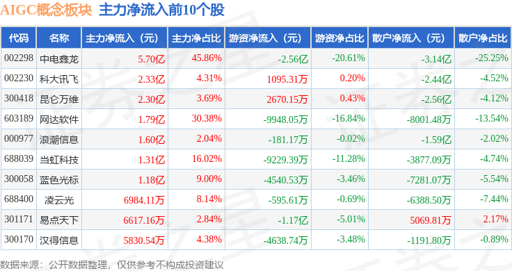 从资金流向上来看,当日AIGC概念板块主力资金净流入8.79亿元,游资资金净流出1.38亿元,散户资金净流出7.41亿元。AIGC概念板块个股资金流向见下表: