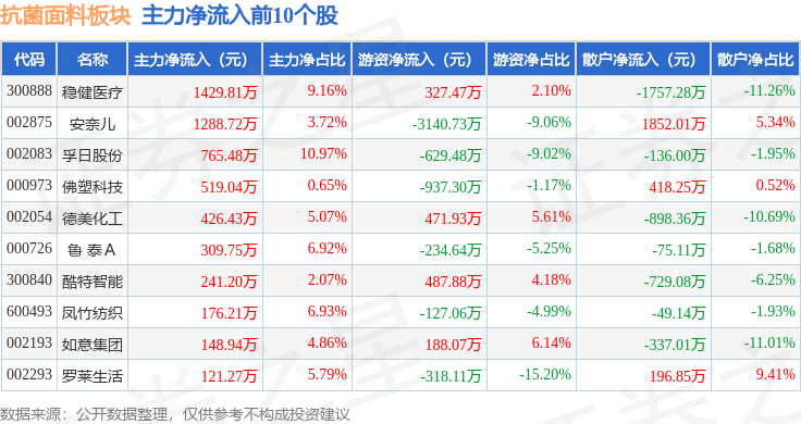 从资金流向上来看,当日抗菌面料板块主力资金净流出1.17亿元,游资资金净流出7145.21万元,散户资金净流入1.89亿元。抗菌面料板块个股资金流向见下表: