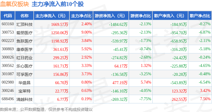 从资金流向上来看,当日血氧仪板块主力资金净流入1134.8万元,游资资金净流出2326.62万元,散户资金净流入1191.82万元。血氧仪板块个股资金流向见下表: