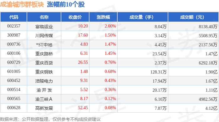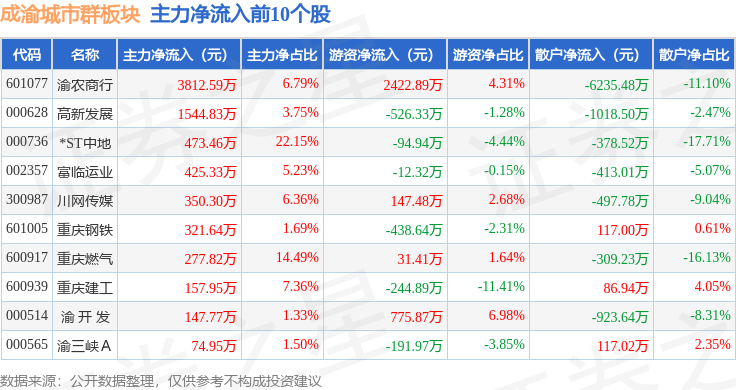 从资金流向上来看,当日成渝城市群板块主力资金净流出1.5亿元,游资资金净流入7910.61万元,散户资金净流入7068.99万元。成渝城市群板块个股资金流向见下表: