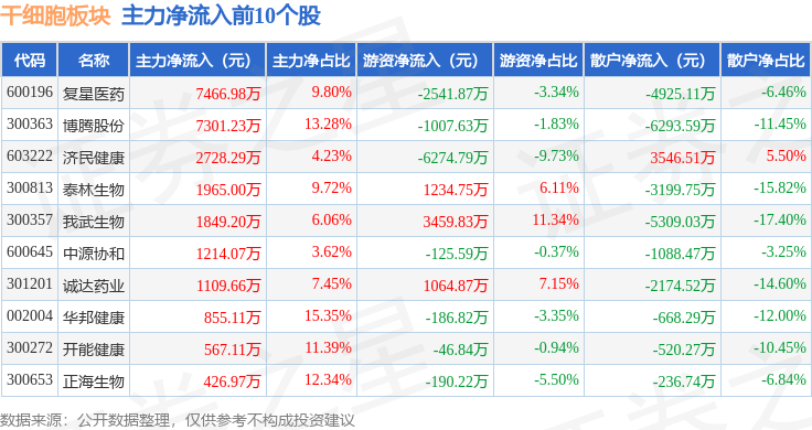 从资金流向上来看,当日干细胞板块主力资金净流出4965.39万元,游资资金净流入3032.6万元,散户资金净流入1932.79万元。干细胞板块个股资金流向见下表: