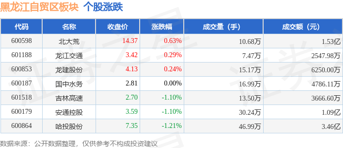 从资金流向上来看,当日黑龙江自贸区板块主力资金净流出3197.81万元,游资资金净流入812.6万元,散户资金净流入2385.22万元。黑龙江自贸区板块个股资金流向见下表: