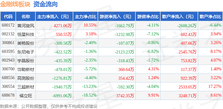 从资金流向上来看,当日金刚线板块主力资金净流出7023.5万元,游资资金净流出1579.41万元,散户资金净流入8602.91万元。金刚线板块个股资金流向见下表: