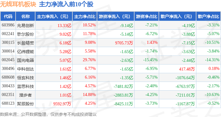 从资金流向上来看,当日无线耳机板块主力资金净流出4.55亿元,游资资金净流出1319.98万元,散户资金净流入4.68亿元。无线耳机板块个股资金流向见下表: