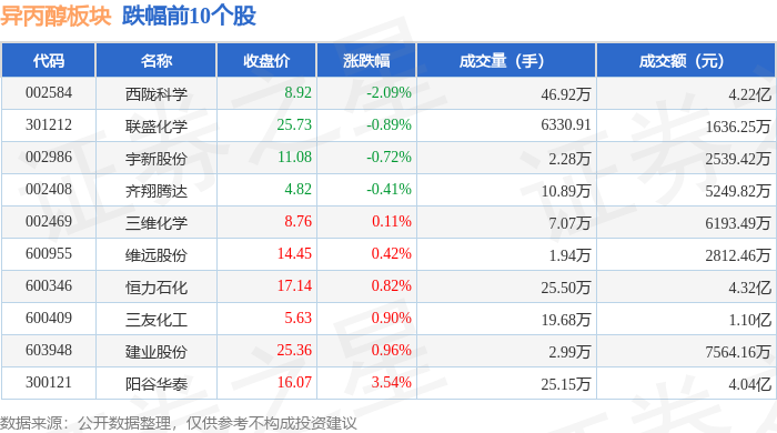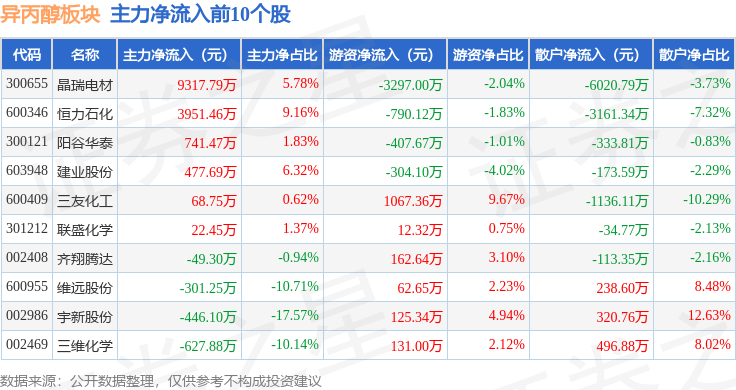 从资金流向上来看,当日异丙醇板块主力资金净流入6296.37万元,游资资金净流出9467.72万元,散户资金净流入3171.35万元。异丙醇板块个股资金流向见下表: