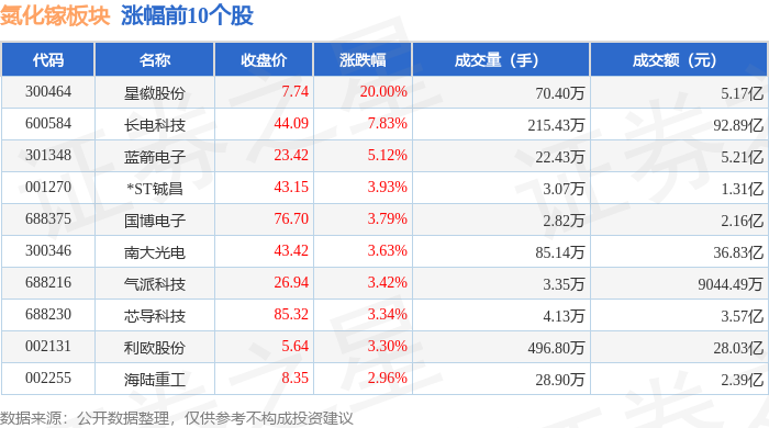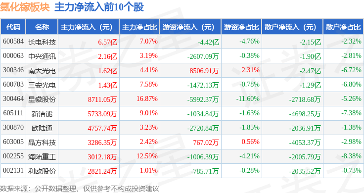从资金流向上来看,当日氮化镓板块主力资金净流出48.87亿元,游资资金净流入19.06亿元,散户资金净流入29.81亿元。氮化镓板块个股资金流向见下表: