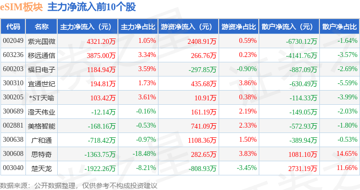 从资金流向上来看,当日eSIM板块主力资金净流出1.77亿元,游资资金净流入2756.45万元,散户资金净流入1.49亿元。eSIM板块个股资金流向见下表: