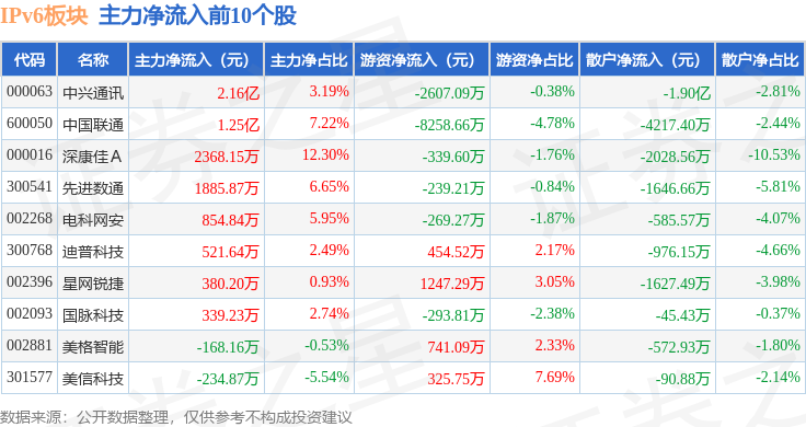 从资金流向上来看,当日IPv6板块主力资金净流出9.63亿元,游资资金净流入2.96亿元,散户资金净流入6.67亿元。IPv6板块个股资金流向见下表: