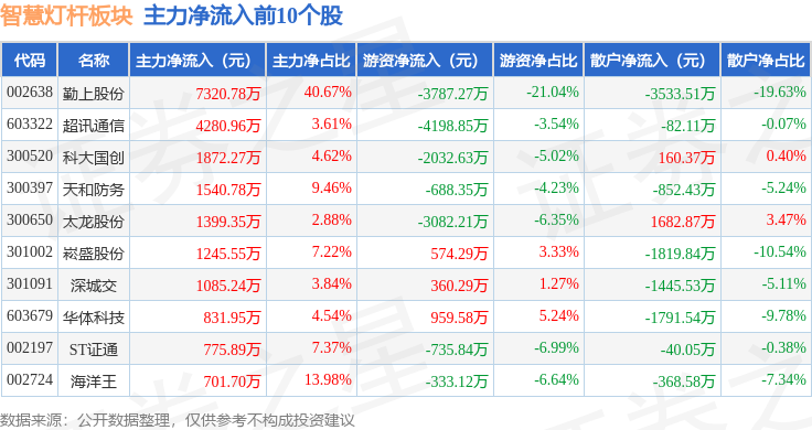 从资金流向上来看,当日智慧灯杆板块主力资金净流出9053.26万元,游资资金净流出1.34亿元,散户资金净流入2.25亿元。智慧灯杆板块个股资金流向见下表:
