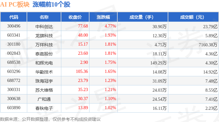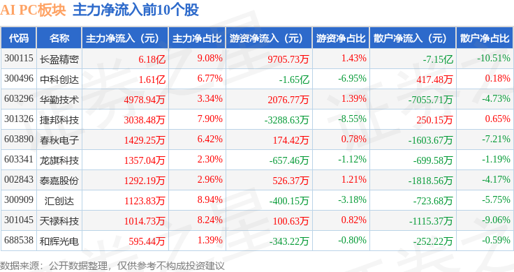 从资金流向上来看,当日AI PC板块主力资金净流出26.18亿元,游资资金净流入12.95亿元,散户资金净流入13.23亿元。AI PC板块个股资金流向见下表: