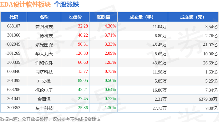 证券之星消息,9月30日EDA设计软件板块较上一交易日上涨1.94%,安路科技领涨。当日上证指数报收于3882.78,上涨0.52%。深证成指报收于13526.51,上涨0.35%。EDA设计软件板块个股涨跌见下表: