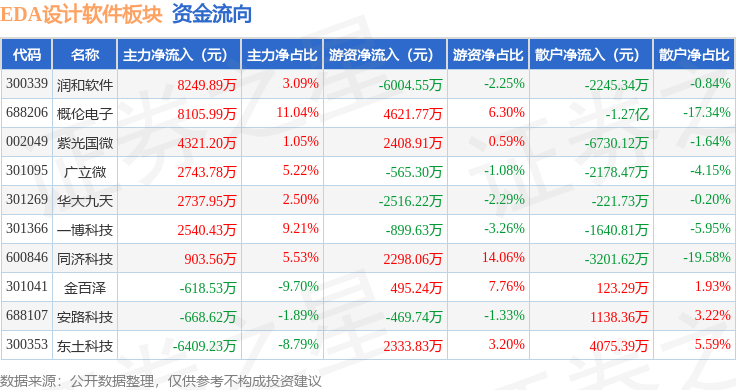 从资金流向上来看,当日EDA设计软件板块主力资金净流入2.19亿元,游资资金净流入1702.39万元,散户资金净流出2.36亿元。EDA设计软件板块个股资金流向见下表:
