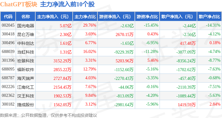 从资金流向上来看,当日ChatGPT板块主力资金净流出5.87亿元,游资资金净流出63.37万元,散户资金净流入5.87亿元。ChatGPT板块个股资金流向见下表: