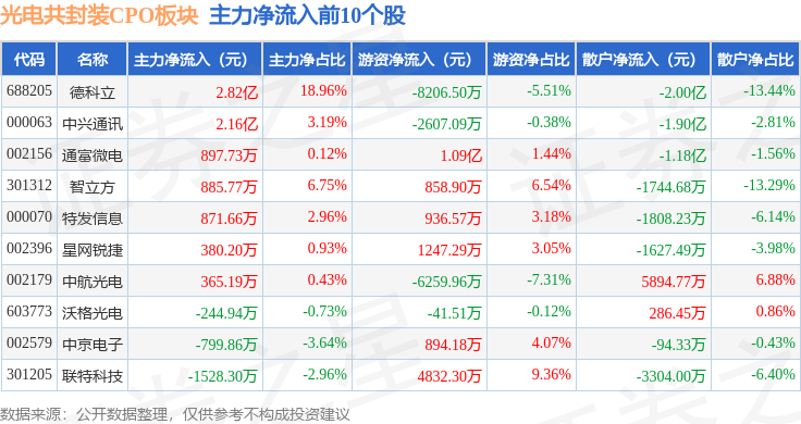 从资金流向上来看,当日光电共封装CPO板块主力资金净流出69.39亿元,游资资金净流入31.76亿元,散户资金净流入37.63亿元。光电共封装CPO板块个股资金流向见下表: