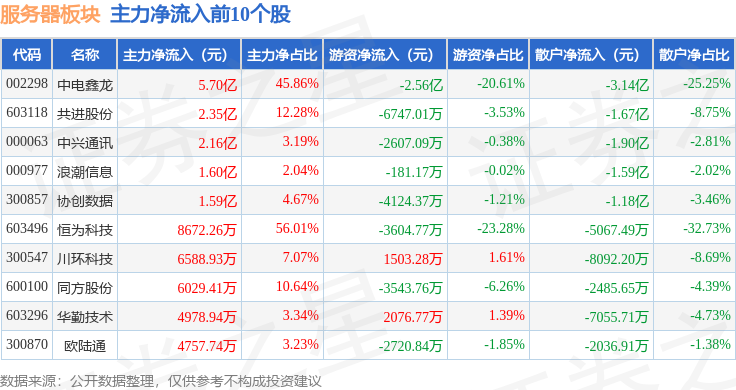 从资金流向上来看,当日服务器板块主力资金净流出25.18亿元,游资资金净流入12.27亿元,散户资金净流入12.91亿元。服务器板块个股资金流向见下表: