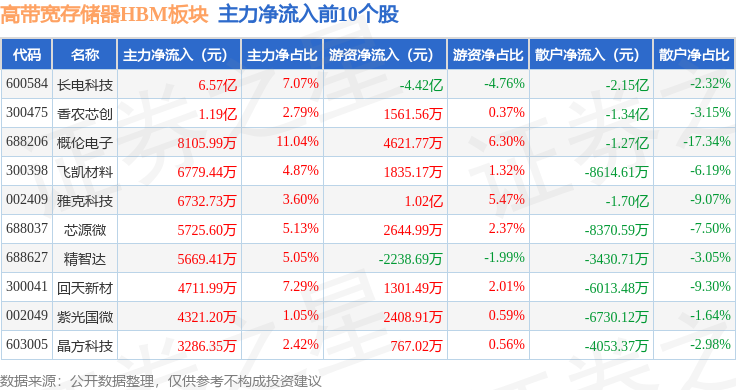 从资金流向上来看,当日高带宽存储器HBM板块主力资金净流入5.94亿元,游资资金净流入304.36万元,散户资金净流出5.97亿元。高带宽存储器HBM板块个股资金流向见下表: