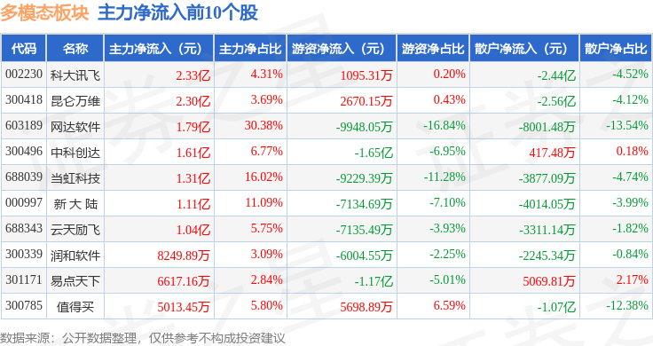 从资金流向上来看,当日多模态板块主力资金净流入7.68亿元,游资资金净流出4.96亿元,散户资金净流出2.72亿元。多模态板块个股资金流向见下表: