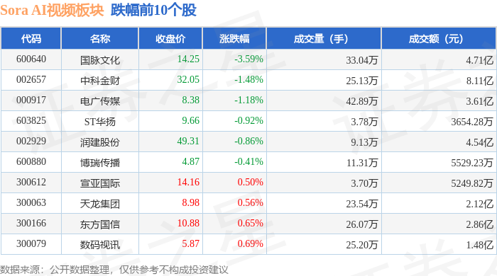 从资金流向上来看,当日Sora AI视频板块主力资金净流入3.03亿元,游资资金净流出3.57亿元,散户资金净流入5405.08万元。Sora AI视频板块个股资金流向见下表: