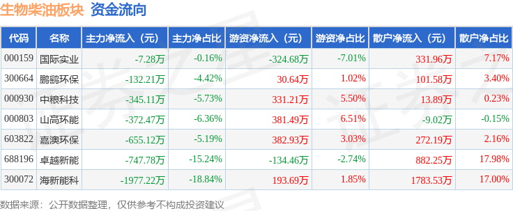 从资金流向上来看,当日生物柴油板块主力资金净流出4237.19万元,游资资金净流入860.81万元,散户资金净流入3376.38万元。生物柴油板块个股资金流向见下表: