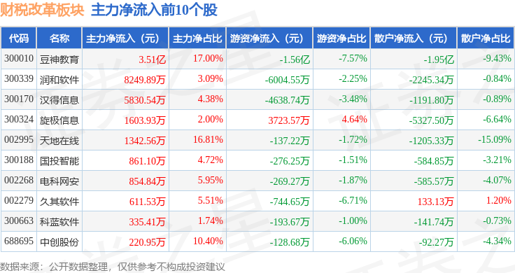 从资金流向上来看,当日财税改革板块主力资金净流入2.58亿元,游资资金净流出2.03亿元,散户资金净流出5552.06万元。财税改革板块个股资金流向见下表:
