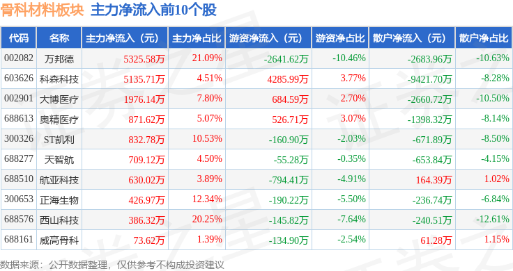 从资金流向上来看,当日骨科材料板块主力资金净流入1.03亿元,游资资金净流入3017.54万元,散户资金净流出1.33亿元。骨科材料板块个股资金流向见下表: