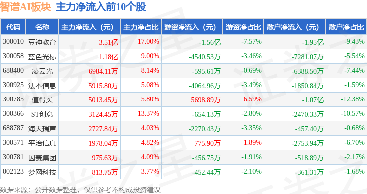 从资金流向上来看,当日智谱AI板块主力资金净流出8.63亿元,游资资金净流入2.98亿元,散户资金净流入5.65亿元。智谱AI板块个股资金流向见下表: