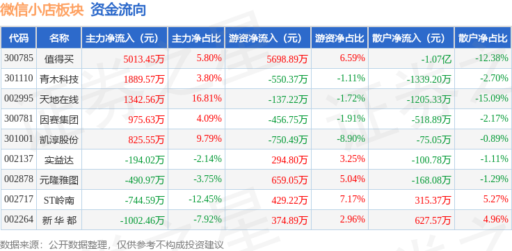 从资金流向上来看,当日微信小店板块主力资金净流入7614.71万元,游资资金净流入5562.03万元,散户资金净流出1.32亿元。微信小店板块个股资金流向见下表: