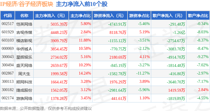 从资金流向上来看,当日IP经济/谷子经济板块主力资金净流出9.35亿元,游资资金净流入5.46亿元,散户资金净流入3.89亿元。IP经济/谷子经济板块个股资金流向见下表: