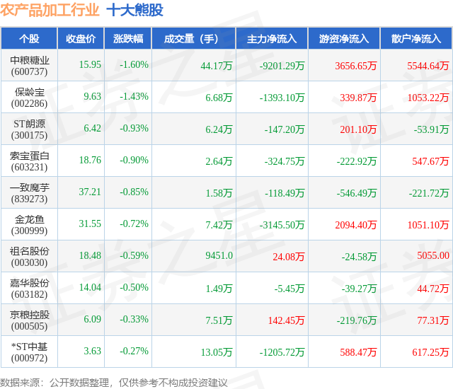 个股表现方面,农产品加工行业当日领跌股为中粮糖业(600737),该股当日报收15.95,下跌1.6%,成交量44.17万,主力资金净流出9201.29万元。保龄宝(002286)以下跌1.43%紧随其后,该股当日成交量6.68万,主力资金净流出1393.1万元。除此之外,ST朗源(300175)、索宝蛋白(603231)、一致魔芋(839273)均进入当日熊股之列。具体个股列表见下表: