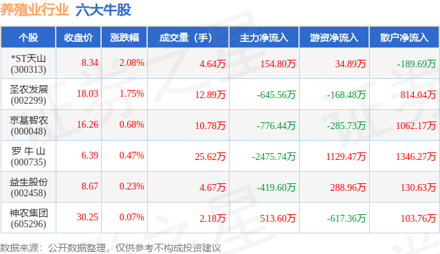 个股表现方面,养殖业行业当日领涨股为*ST天山(300313),该股当日报收8.34,上涨2.08%,成交量4.64万,主力资金净流入154.8万元。圣农发展(002299)以上涨1.75%紧随其后,该股当日成交量12.89万,主力资金净流出645.56万元。除此之外,京基智农(000048)、罗 牛 山(000735)、益生股份(002458)均进入当日牛股之列。具体个股列表见下表: