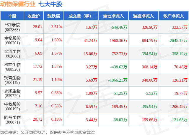 个股表现方面,动物保健行业当日领涨股为*ST绿康(002868),该股当日报收28.01,上涨3.51%,成交量1.67万,主力资金净流出649.46万元。生物股份(600201)以上涨1.69%紧随其后,该股当日成交量41.24万,主力资金净流入1960.36万元。除此之外,金河生物(002688)、科前生物(688526)、瑞普生物(300119)均进入当日牛股之列。具体个股列表见下表: