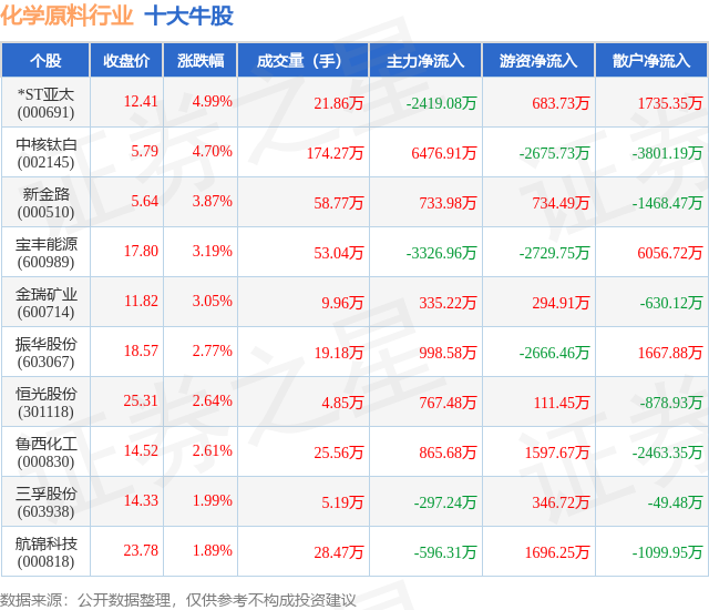 个股表现方面,化学原料行业当日领涨股为*ST亚太(000691),该股当日报收12.41,上涨4.99%,成交量21.86万,主力资金净流出2419.08万元。中核钛白(002145)以上涨4.7%紧随其后,该股当日成交量174.27万,主力资金净流入6476.91万元。除此之外,新金路(000510)、宝丰能源(600989)、金瑞矿业(600714)均进入当日牛股之列。具体个股列表见下表: