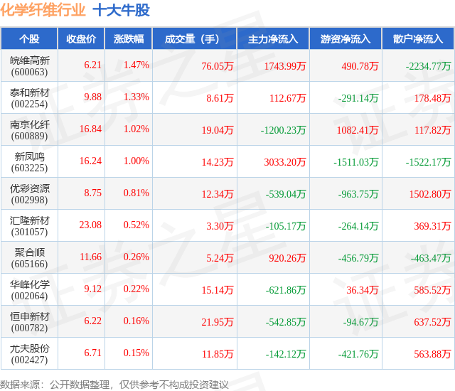 个股表现方面,化学纤维行业当日领涨股为皖维高新(600063),该股当日报收6.21,上涨1.47%,成交量76.05万,主力资金净流入1743.99万元。泰和新材(002254)以上涨1.33%紧随其后,该股当日成交量8.61万,主力资金净流入112.67万元。除此之外,南京化纤(600889)、新凤鸣(603225)、优彩资源(002998)均进入当日牛股之列。具体个股列表见下表: