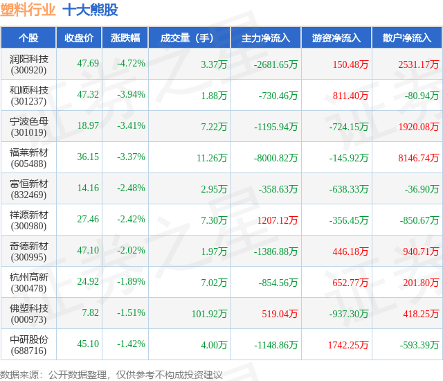 个股表现方面,塑料行业当日领跌股为润阳科技(300920),该股当日报收47.69,下跌4.72%,成交量3.37万,主力资金净流出2681.65万元。和顺科技(301237)以下跌3.94%紧随其后,该股当日成交量1.88万,主力资金净流出730.46万元。除此之外,宁波色母(301019)、福莱新材(605488)、富恒新材(832469)均进入当日熊股之列。具体个股列表见下表:
