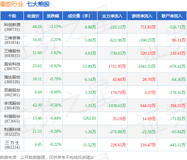 个股表现方面,橡胶行业当日领跌股为科创新源(300731),该股当日报收44.26,下跌3.15%,成交量8.88万,主力资金净流出225.12万元。三维装备(831834)以下跌1.21%紧随其后,该股当日成交量5.0万,主力资金净流出621.98万元。除此之外,三维股份(603033)、震安科技(300767)、海达股份(300320)均进入当日熊股之列。具体个股列表见下表: