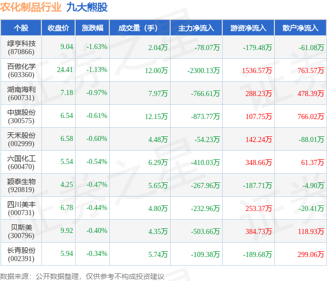 个股表现方面,农化制品行业当日领跌股为绿亨科技(870866),该股当日报收9.04,下跌1.63%,成交量2.04万,主力资金净流出78.07万元。百傲化学(603360)以下跌1.13%紧随其后,该股当日成交量12.0万,主力资金净流出2300.13万元。除此之外,湖南海利(600731)、中旗股份(300575)、天禾股份(002999)均进入当日熊股之列。具体个股列表见下表: