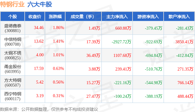 个股表现方面,特钢行业当日领涨股为盛德鑫泰(300881),该股当日报收34.46,上涨1.86%,成交量1.49万,主力资金净流入660.88万元。中信特钢(000708)以上涨1.41%紧随其后,该股当日成交量17.39万,主力资金净流出2927.72万元。除此之外,太钢不锈(000825)、甬金股份(603995)、方大特钢(600507)均进入当日牛股之列。具体个股列表见下表: