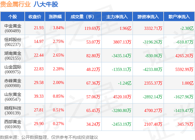 个股表现方面,贵金属行业当日领涨股为中金黄金(600489),该股当日报收21.93,上涨3.84%,成交量119.69万,主力资金净流入1.96亿元。恒邦股份(002237)以上涨2.75%紧随其后,该股当日成交量53.07万,主力资金净流入3807.13万元。除此之外,湖南黄金(002155)、山金国际(000975)、赤峰黄金(600988)均进入当日牛股之列。具体个股列表见下表: